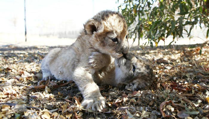 Watching the two little lion cubs boisterously play with each other at a conservation centre outside of South Africa's capital Pretoria, it's hard to see anything out of the ordinary.